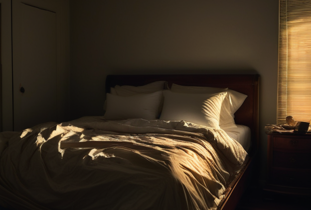 A shadowy bedroom with a messy bed and light casting stripes, suggesting a recent secretive departure.